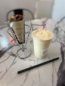 The business itself is a small shop; the walls are painted with fun drawings and shelves with a couple of crepe themed decorations. The workers are very welcoming and direct you to an iPad at the front desk where you can place your order. Once the order is sent through you can go take a seat at the tables and watch them make it just behind the counter and then bring it out to you once it’s done. The crepes are held in a peelable cardboard wrapper that you tear away as you eat, though you also have the options of forks and chopsticks. The different drink options you can order go perfectly with your crepes making for a great meal.